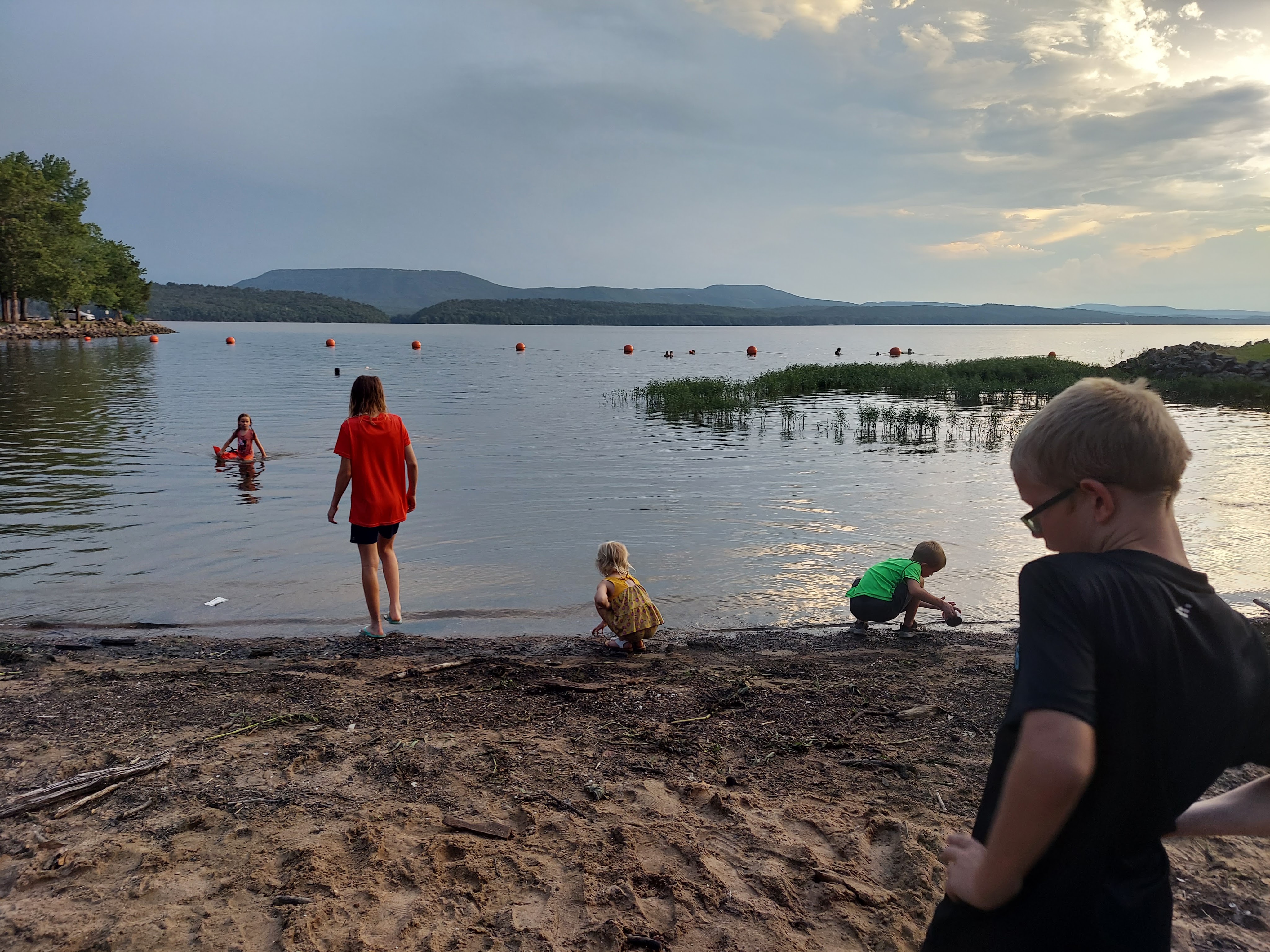 And checking out the watering hole. Our kiddos got used to the clear ocean swimming and the lake “beach” looked quite different. The sunset was absolutely beautiful. When we got back to our campsite we played UNO, Tenzi, and Rummy.