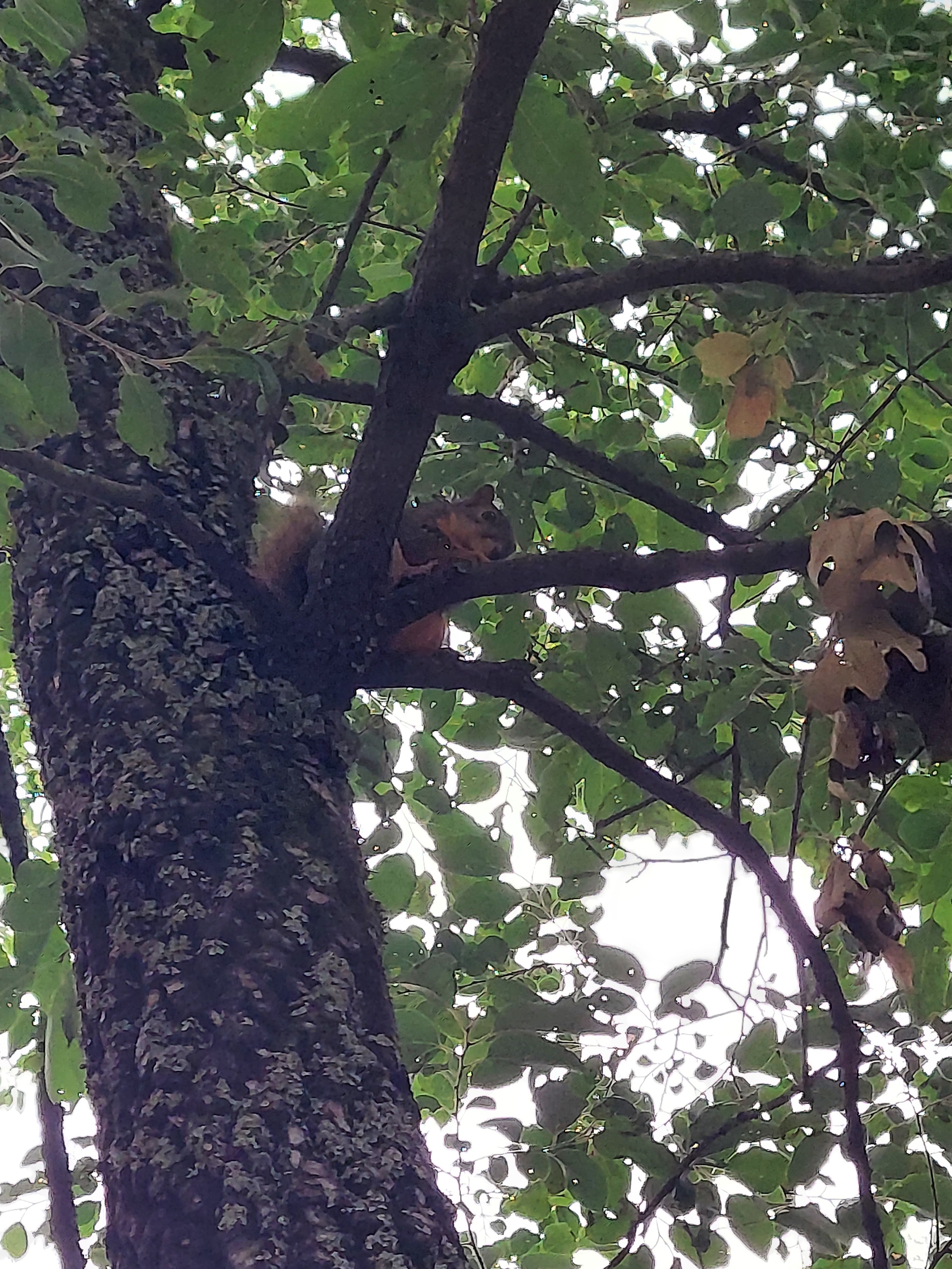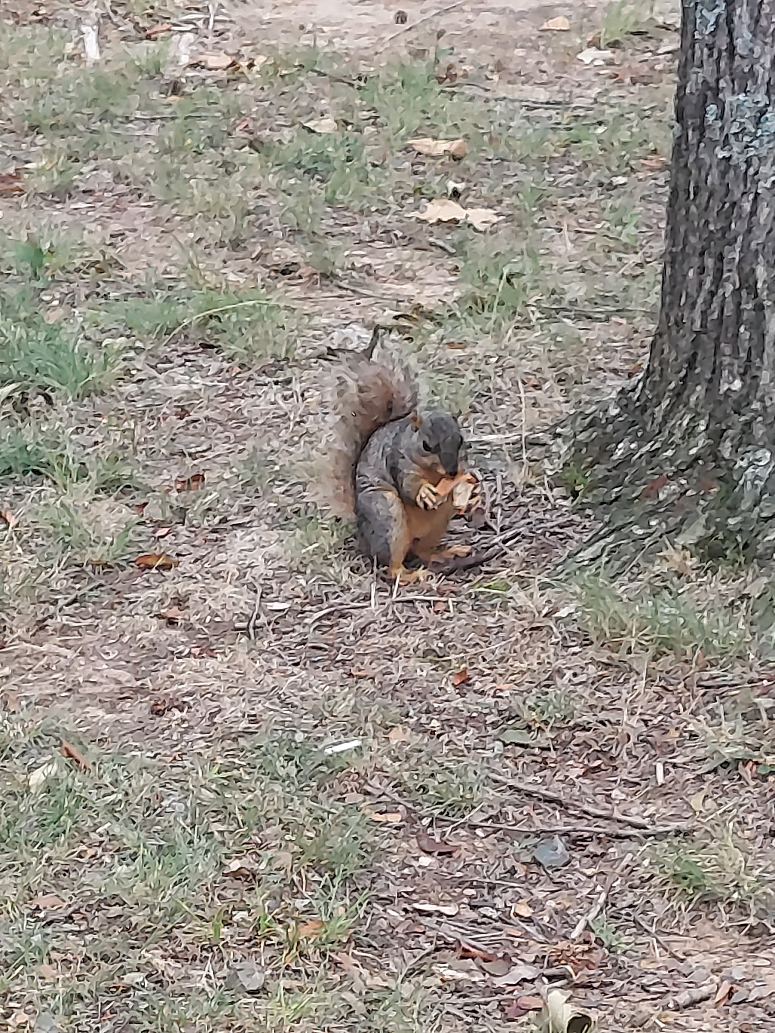 When we got back , we noticed this little guy was eating food and quickly ran up the tree.