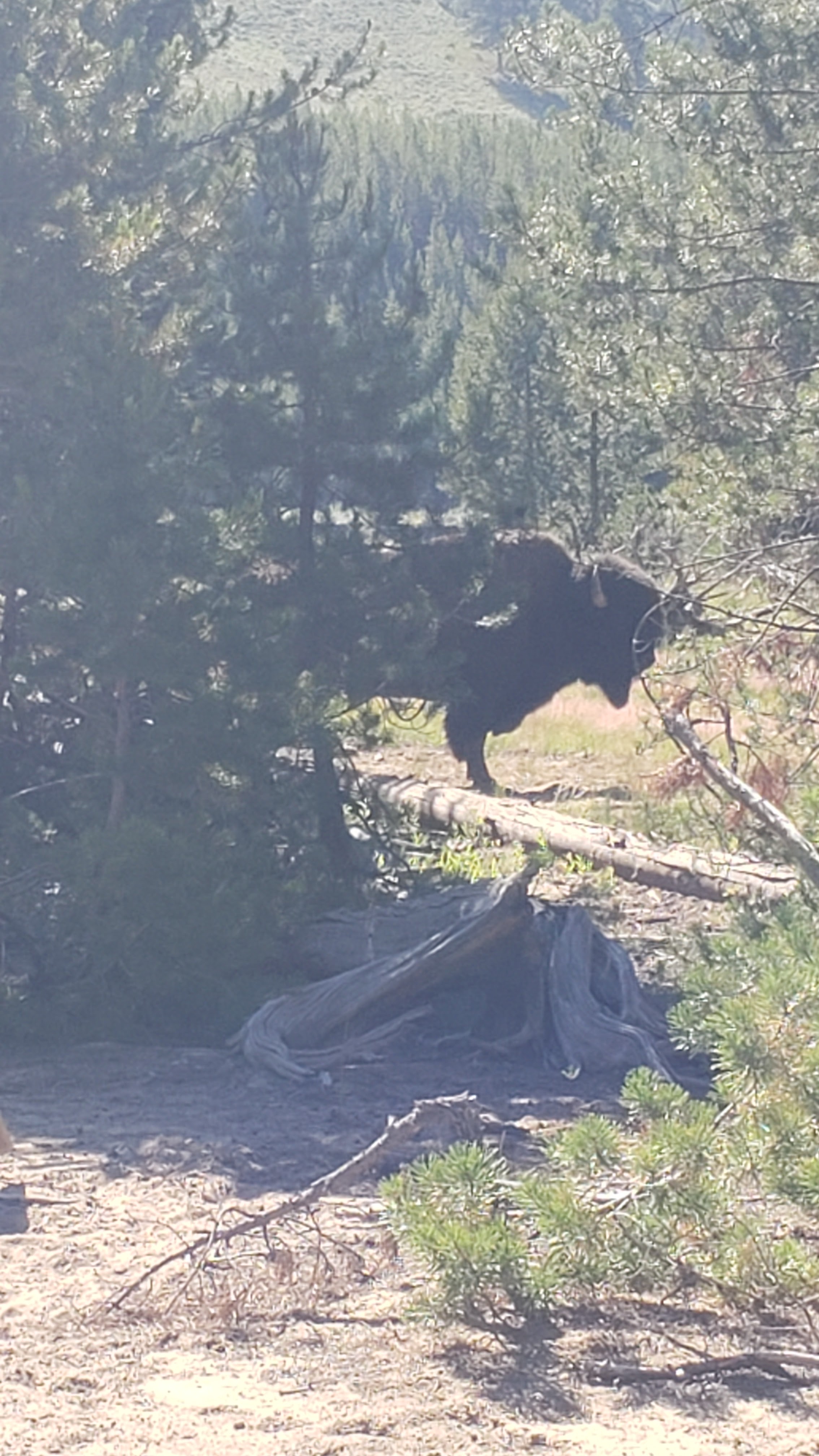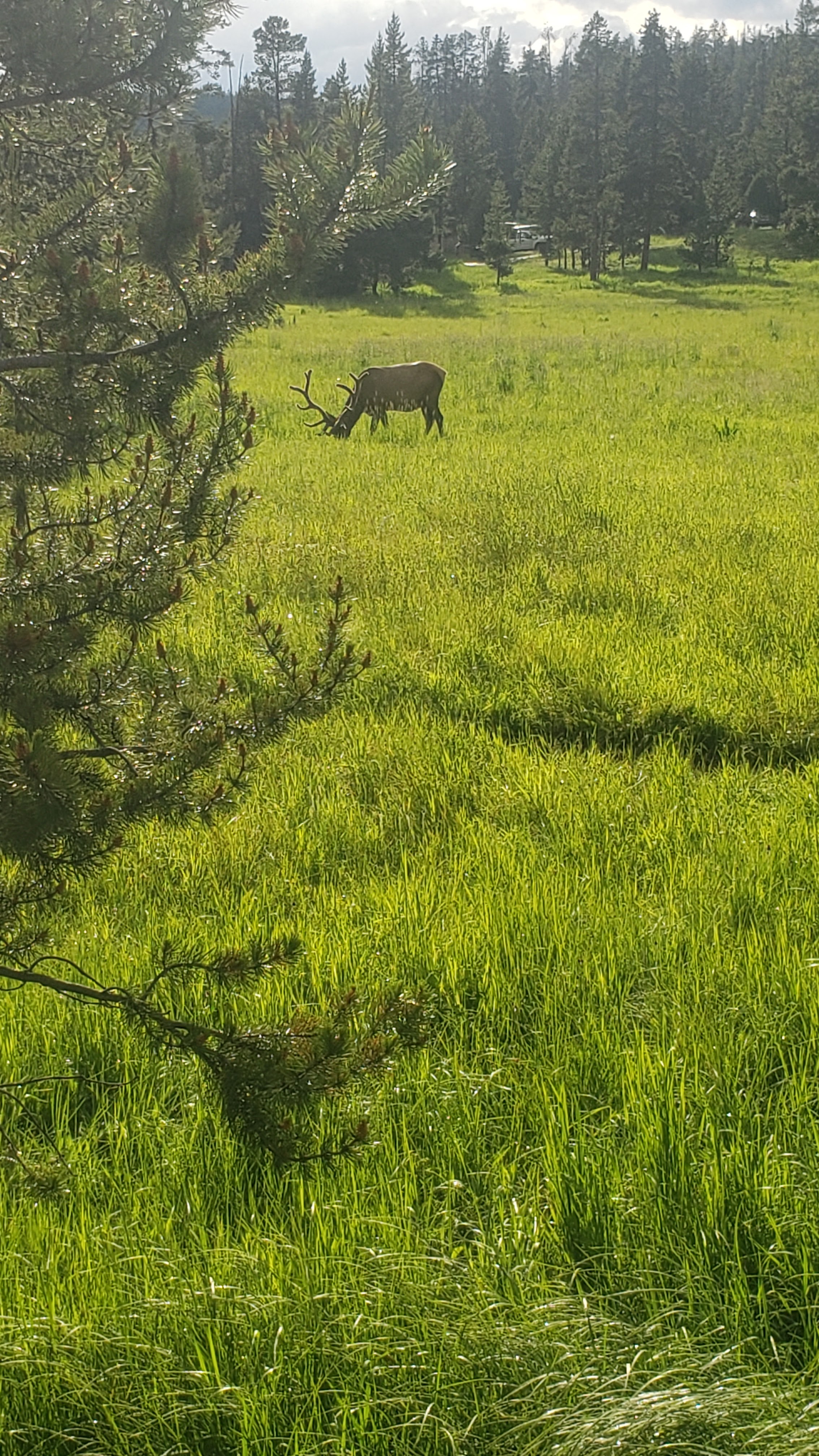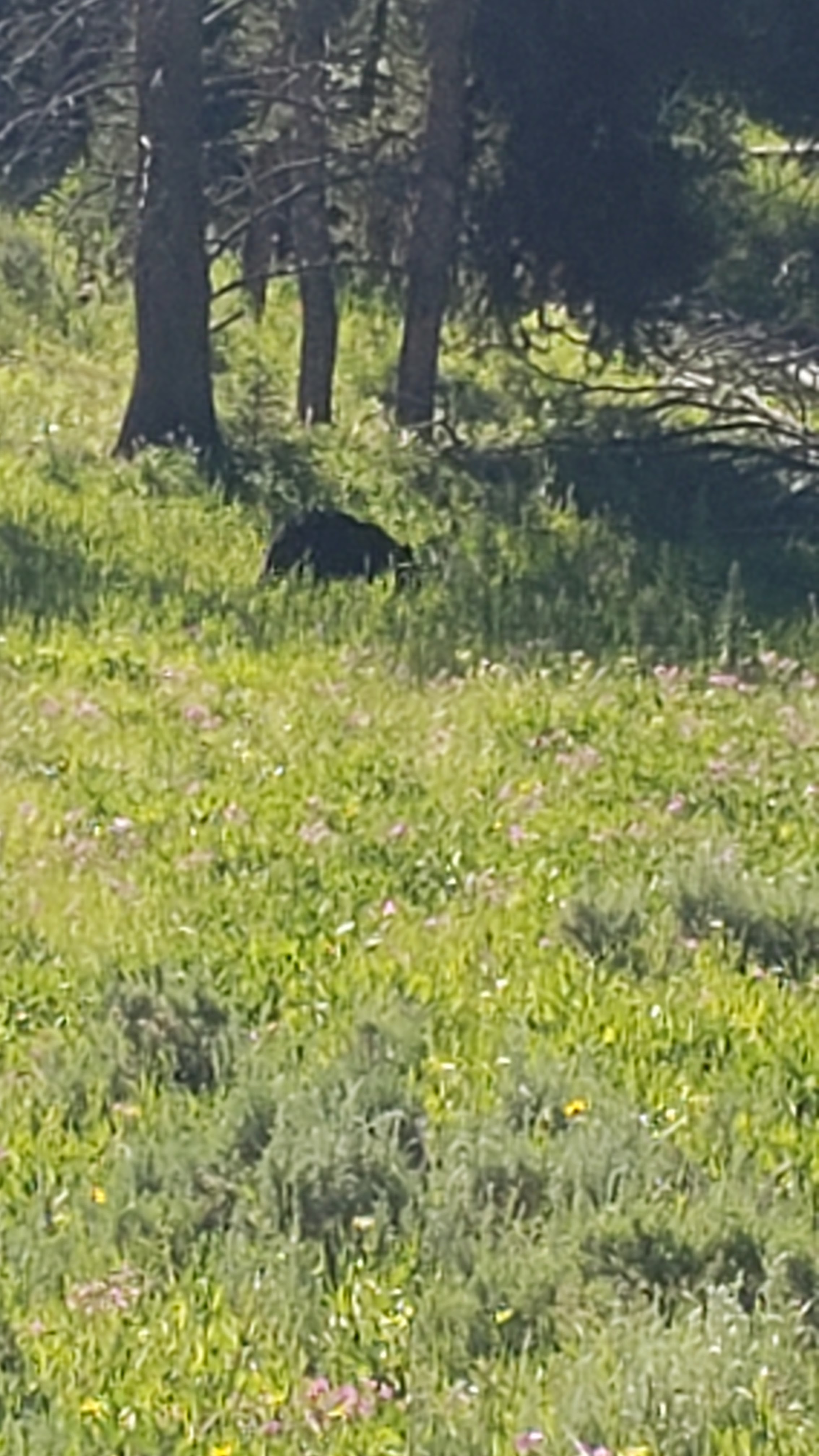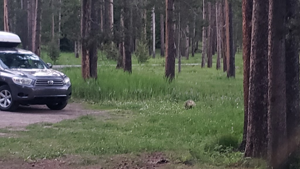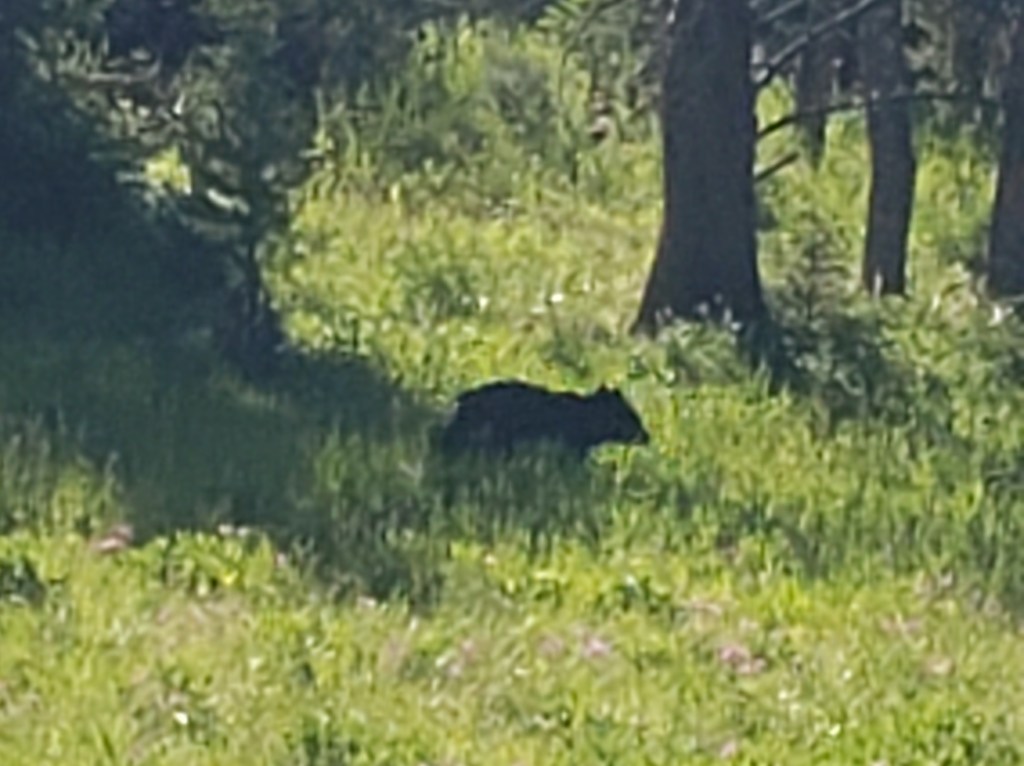 We took a desire line from a pull out to see what was in the meadow. We heard a rustling in the brush and tried to see what was in there, but couldn’t find anything. A few of us went back to the car. Steve and Izzy then spotted this spikey guy. So, then we all got out to take the trail to find him, but couldn’t spot him again. Went back to the car only to find him by our car. First animal spotted at Yellowstone was a porcupine.