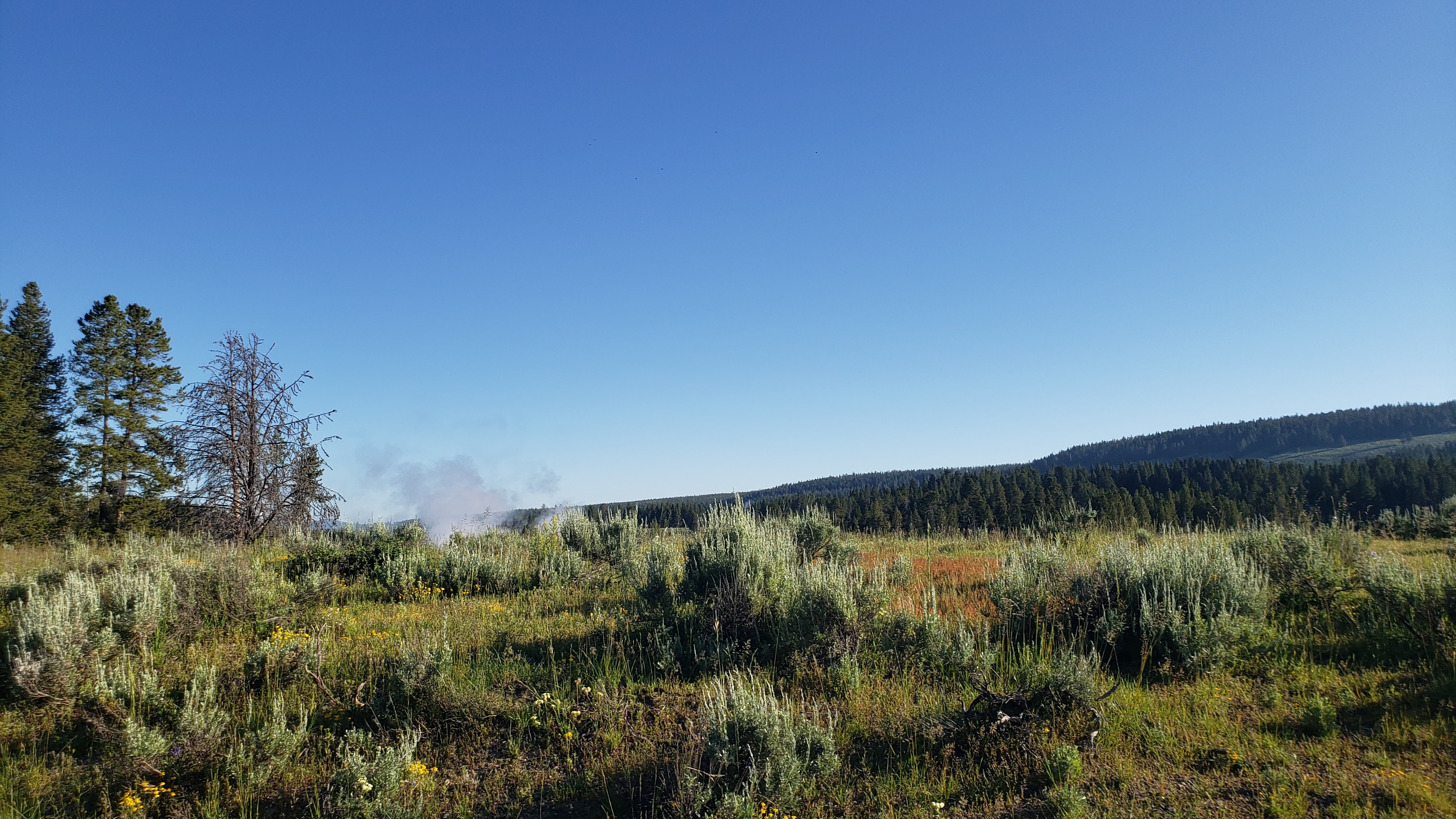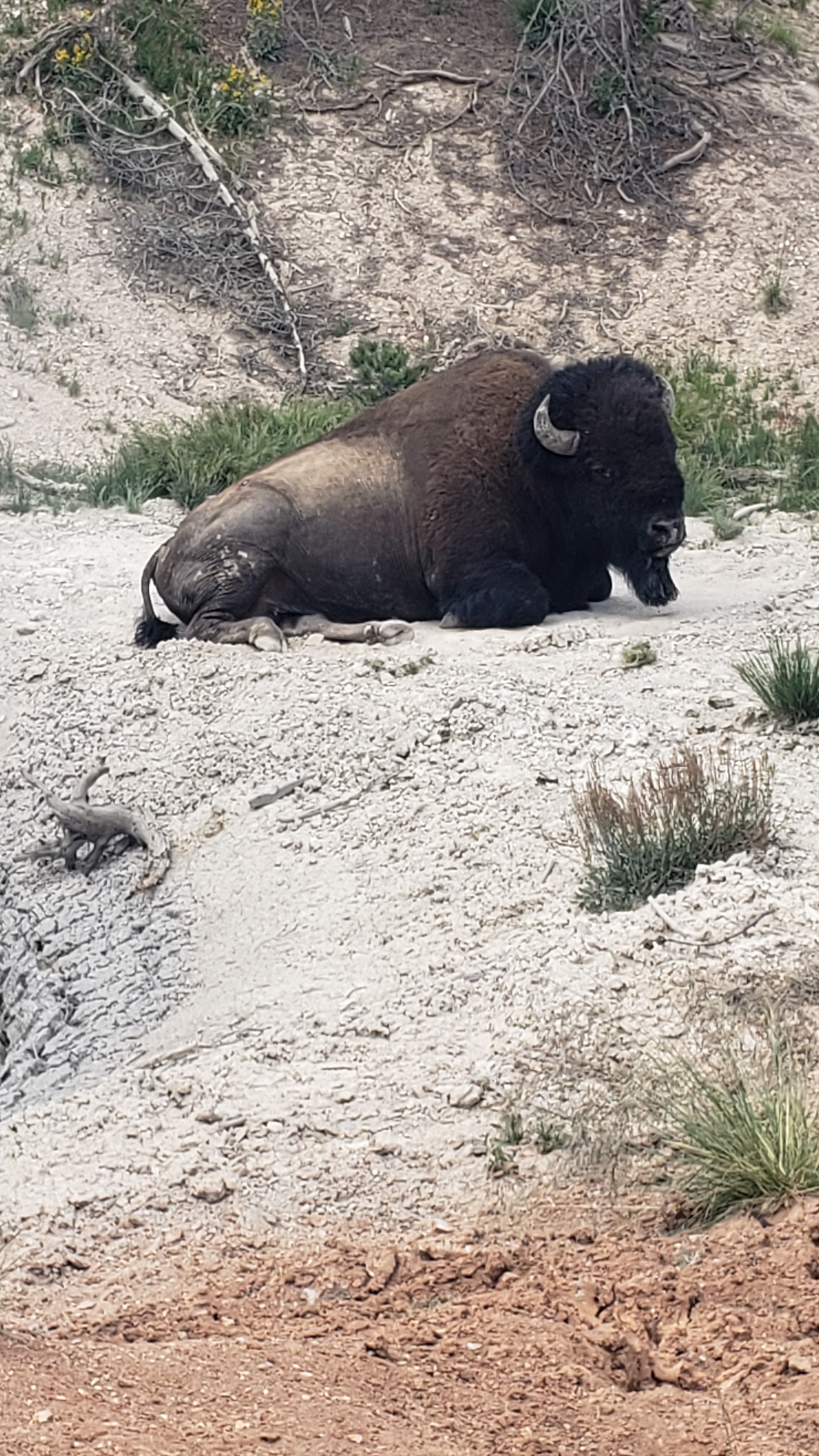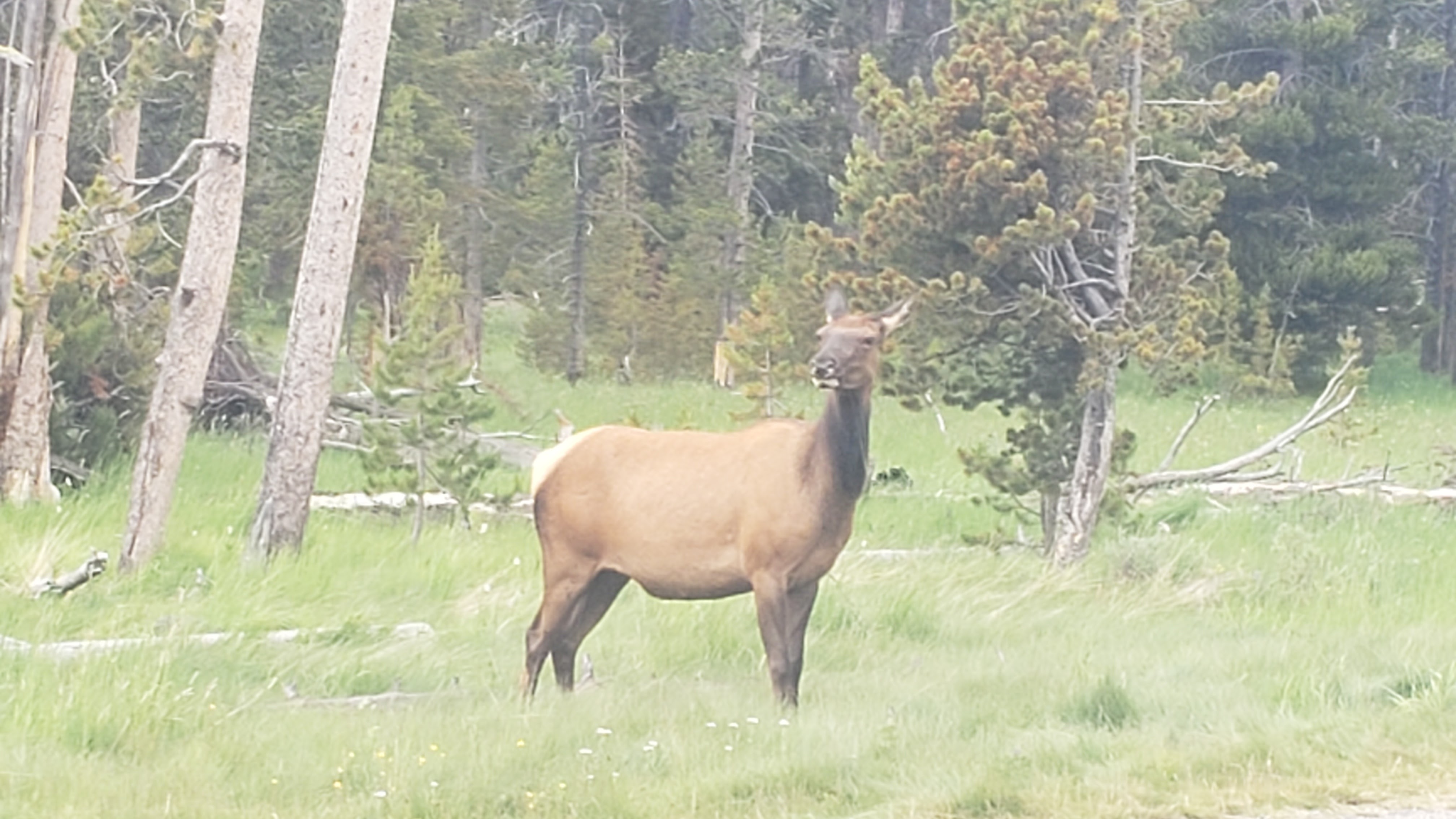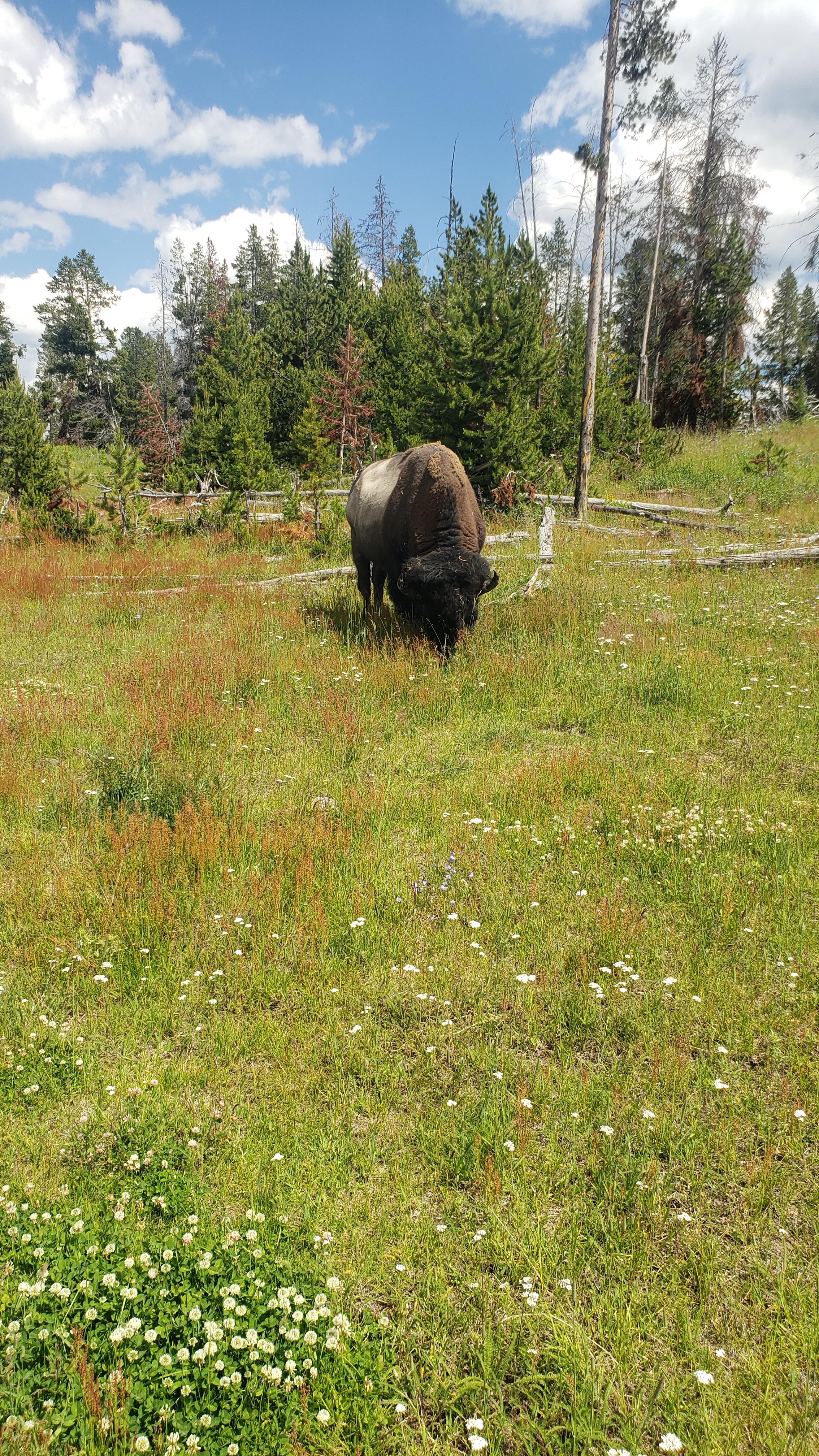 We took a desire line from a pull out to see what was in the meadow. We heard a rustling in the brush and tried to see what was in there, but couldn’t find anything. A few of us went back to the car. Steve and Izzy then spotted this spikey guy. So, then we all got out to take the trail to find him, but couldn’t spot him again. Went back to the car only to find him by our car. First animal spotted at Yellowstone was a porcupine.