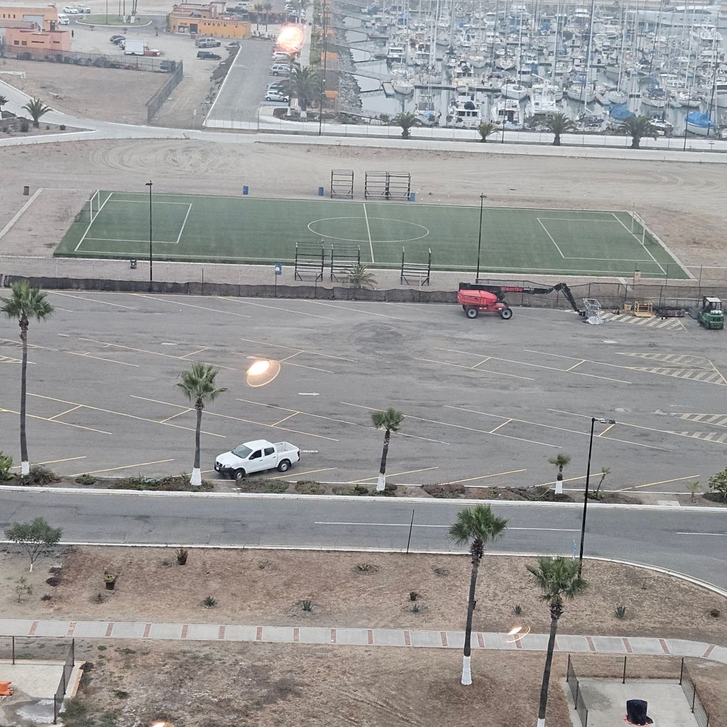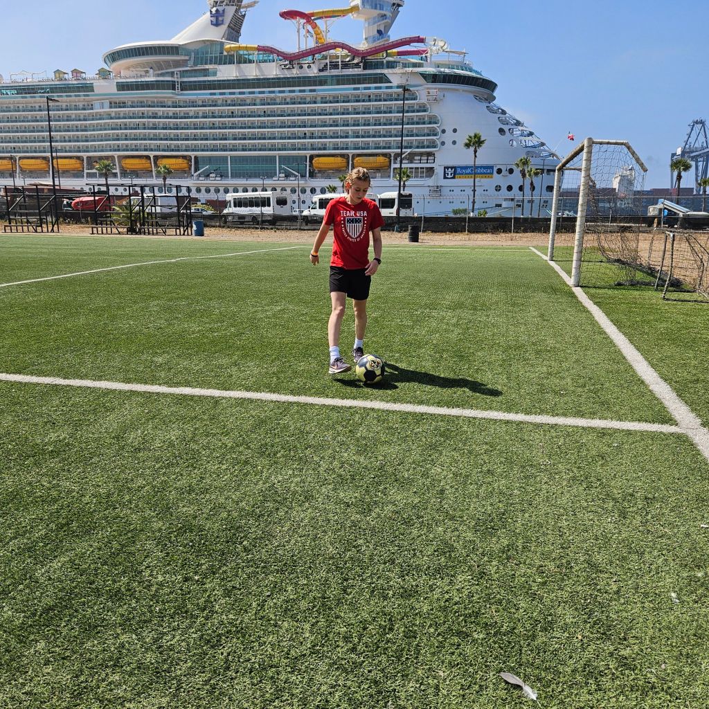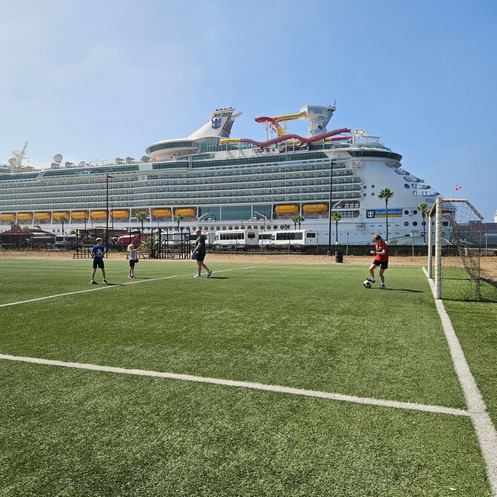 We pulled up to the port, and would you know we pulled right up to a soccer pitch.