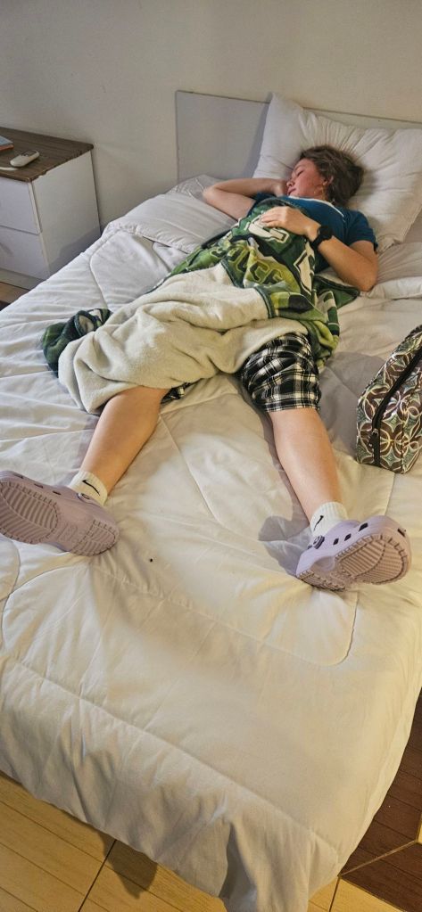 The girls were silly about the AirBNB and slept on top with Crocs on.