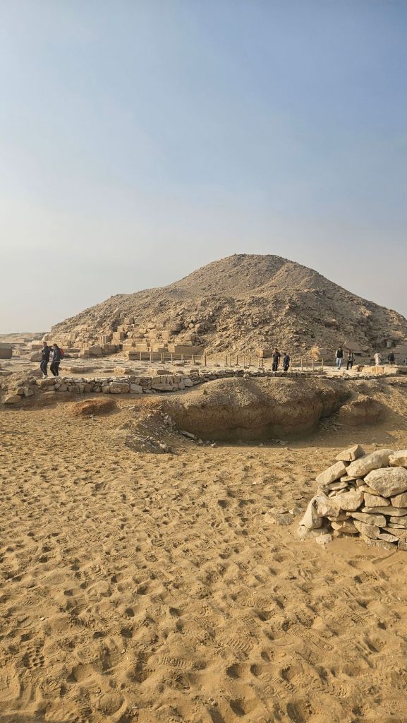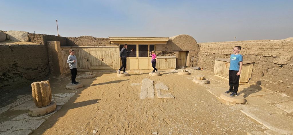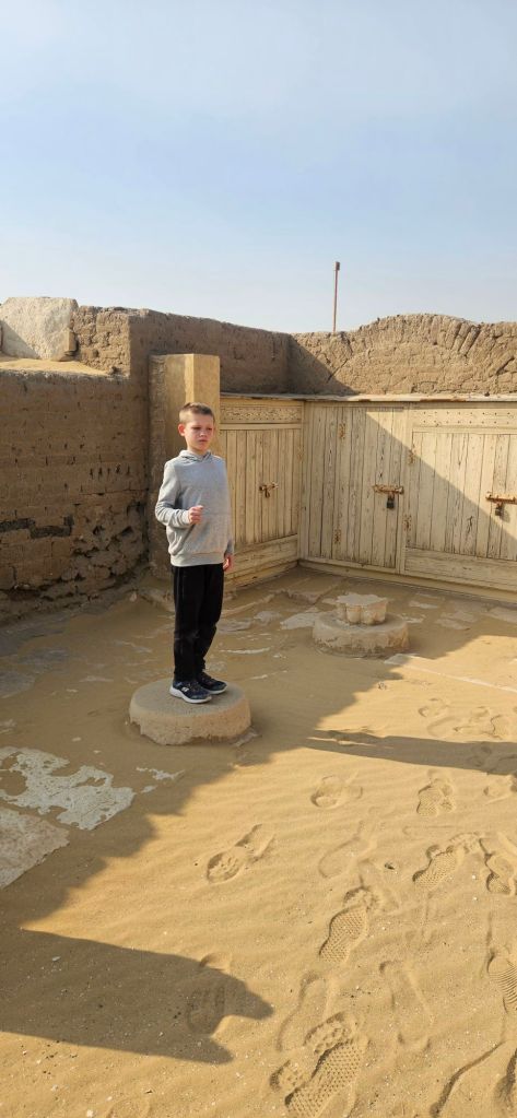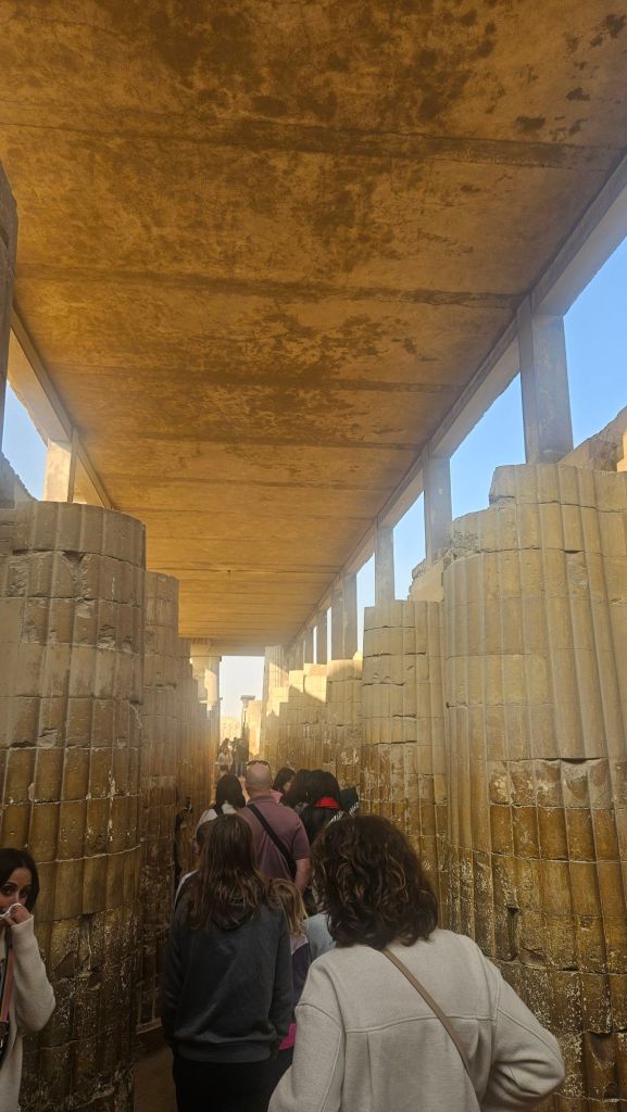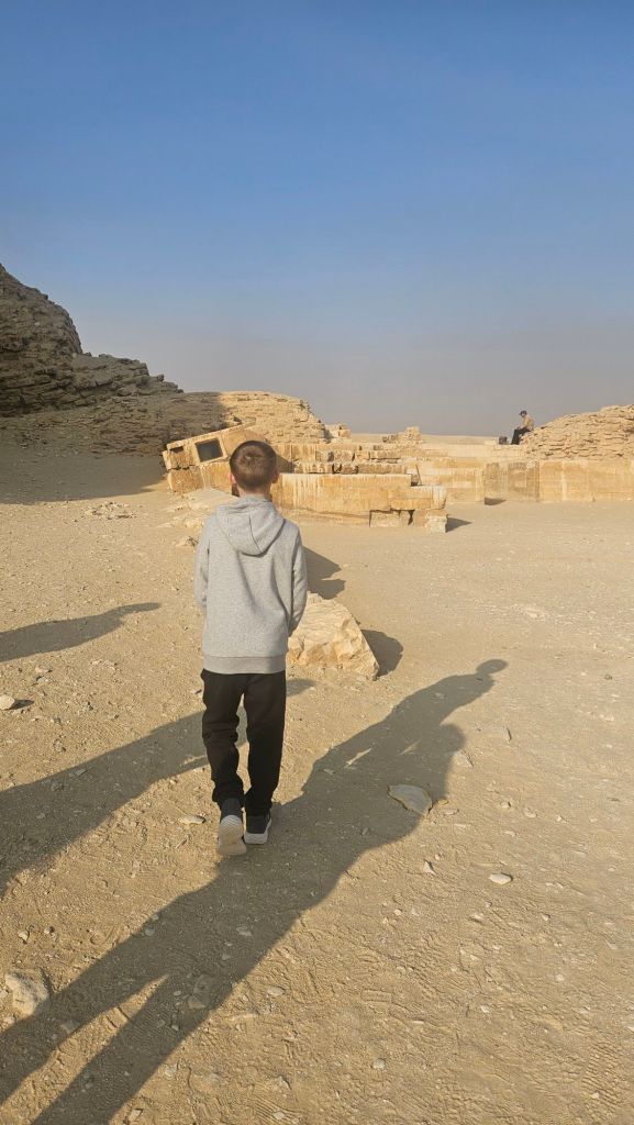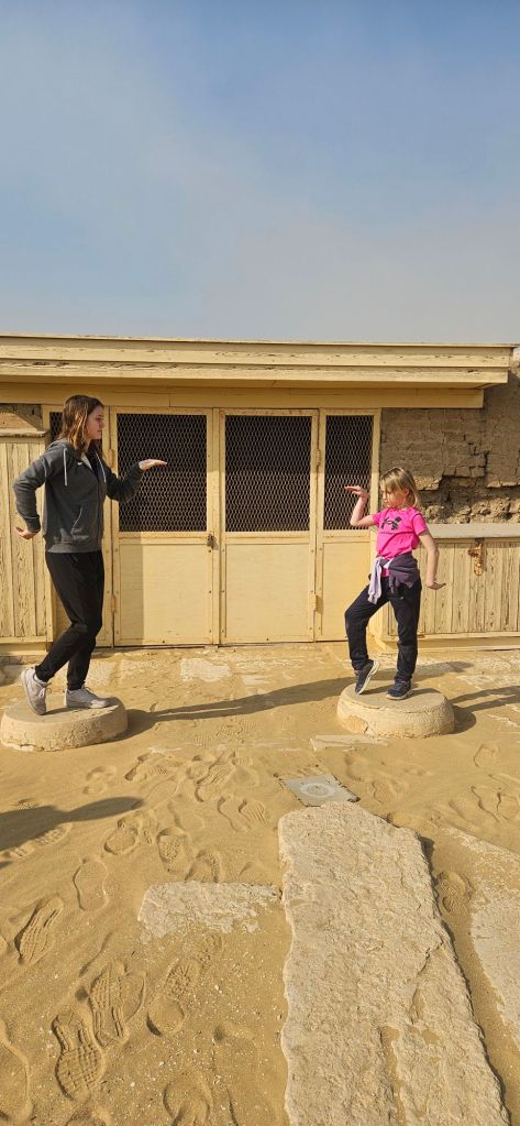 It was about a 45 minute drive from Giza to Saqqara and boy was it eventful. We played “I spy oh my goodness what is that” which included: cars, people, tuk tuks, donkeys with carriages, horses, with carriages, a man with one leg walking in the the road. There was lots of honking and no one drives in the lanes. There is trash everywhere, in the streets, in the canals. Way too many men on one scooter or in a van. It was wild!