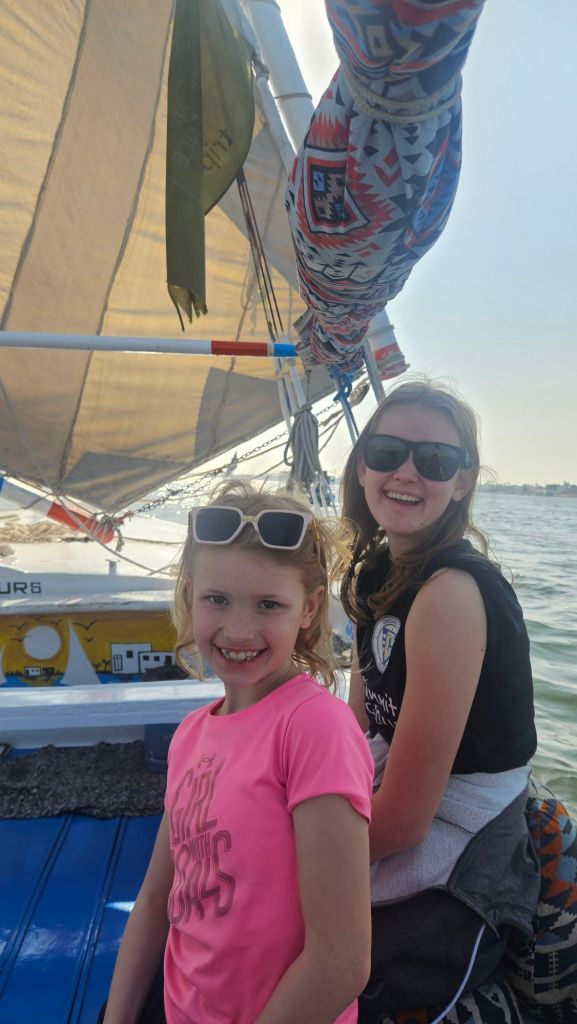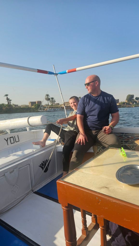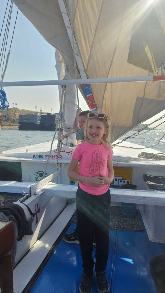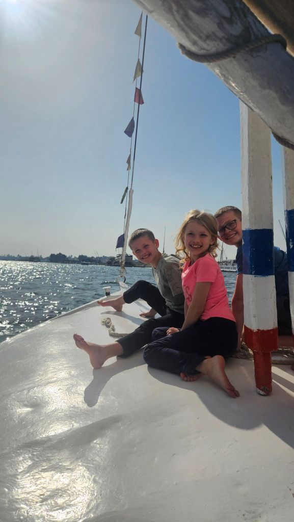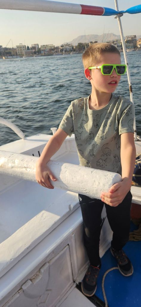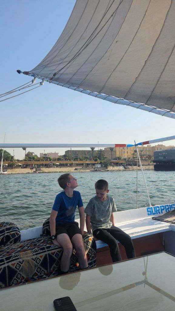 We then headed to the Nile for a cruise down the river. Our guide was great and we loved being back on the water. The kids (and Steven) got to help with the steering and sails.