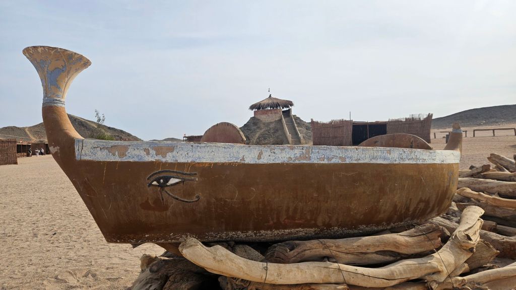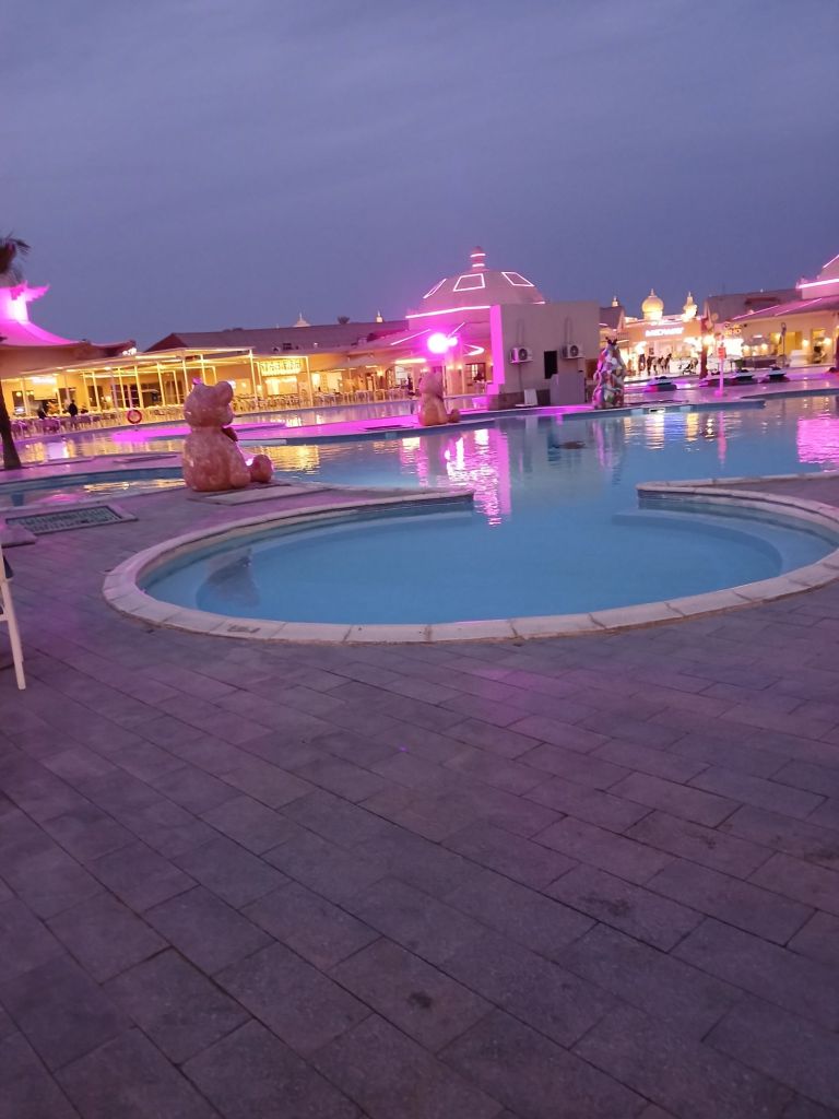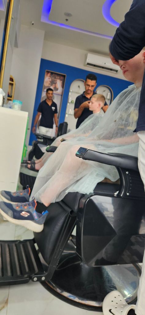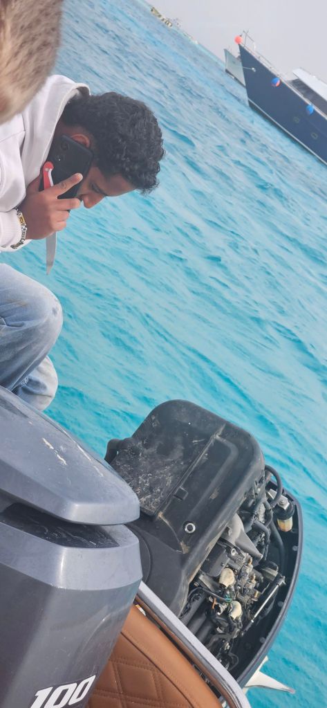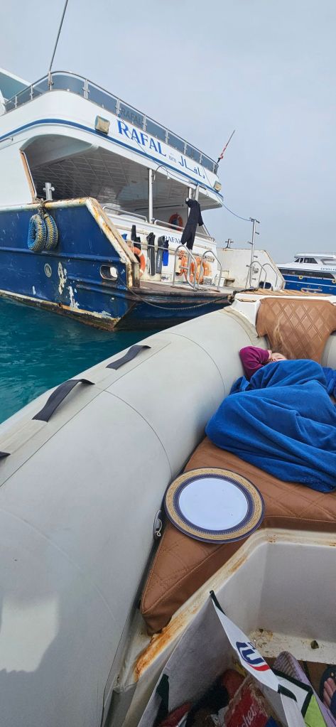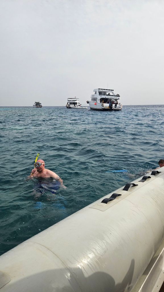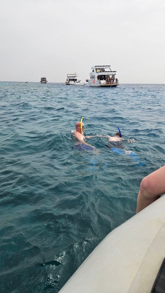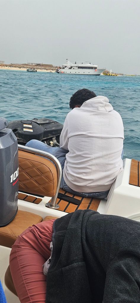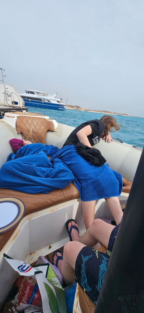 Okay, so now the story behind our beach day. We got into the taxi on time. We get into the car and and ask the driver how long, he says about 15 minutes. We started driving and he takes us down a side street (we are assuming so we can see the town, which like most Egyptian towns is trashy literally). After completing a square, we get back on the main road. He then stops at a market and Egyptian parks, which means where ever you want to, to include right in front of other cars. He says he will be back in 2 minutes. 15 minutes later and after Steve moves the driver’s car so someone could get out of their parking spot, he was back. We then get to the boat dock after 35 minutes. A young boy, maybe 17 year old, is our “captain.” He doesn’t speak English. He takes us out to the snorkle area and then the beach. He pulls the boat up into the sand. When we go to leave, because he parked the boat all the way in the sand, there is sand in the motor. Not a great combination. He leaves, but can’t get the boat in gear. We wave another boat down and he pulls us back toward the beach. He then attaches us to a big boat in the sea, so he can “fix” it. He calls someone and they try to help him fix it. He uses a knife, the one he used to cut fruit we ate, that our driver picked up at the market on our way there. He finally gets it in gear to drive, but only at an idling speed. 3 hours later at 3 km an hour. We made it back to the resort. Whew, it was an adventure.