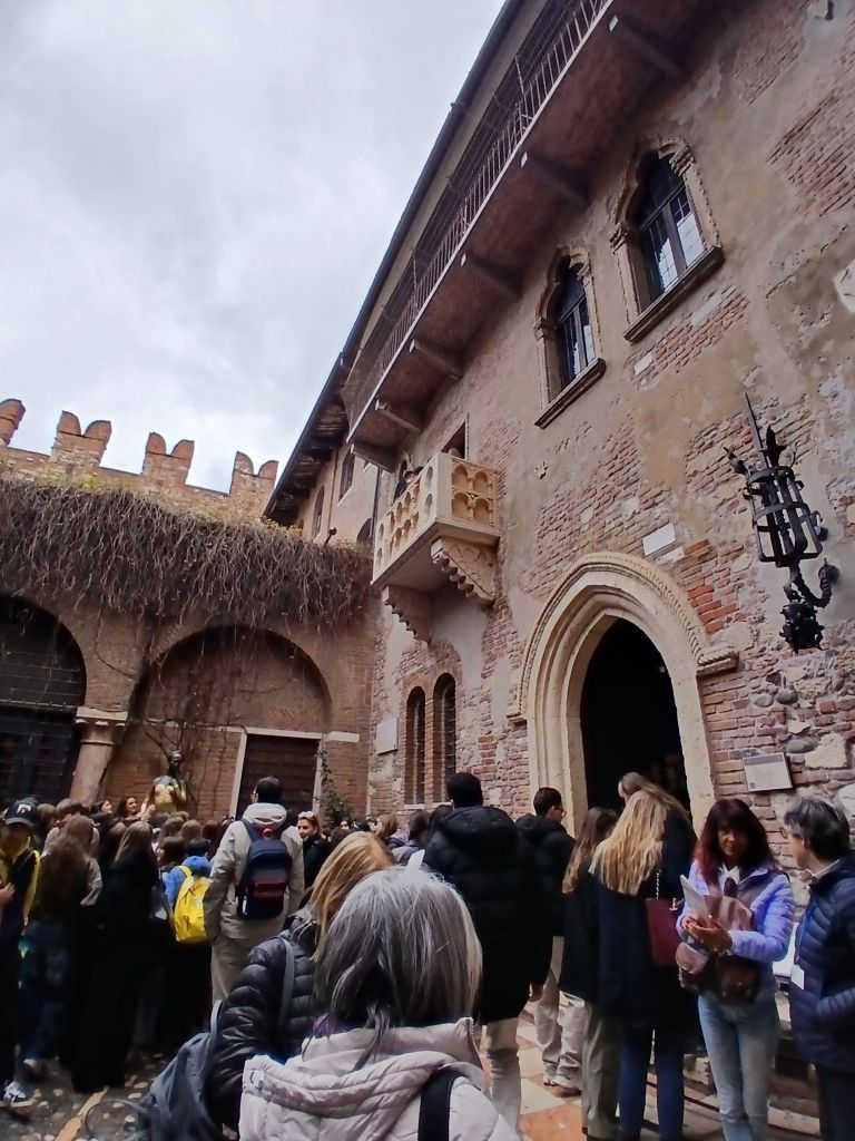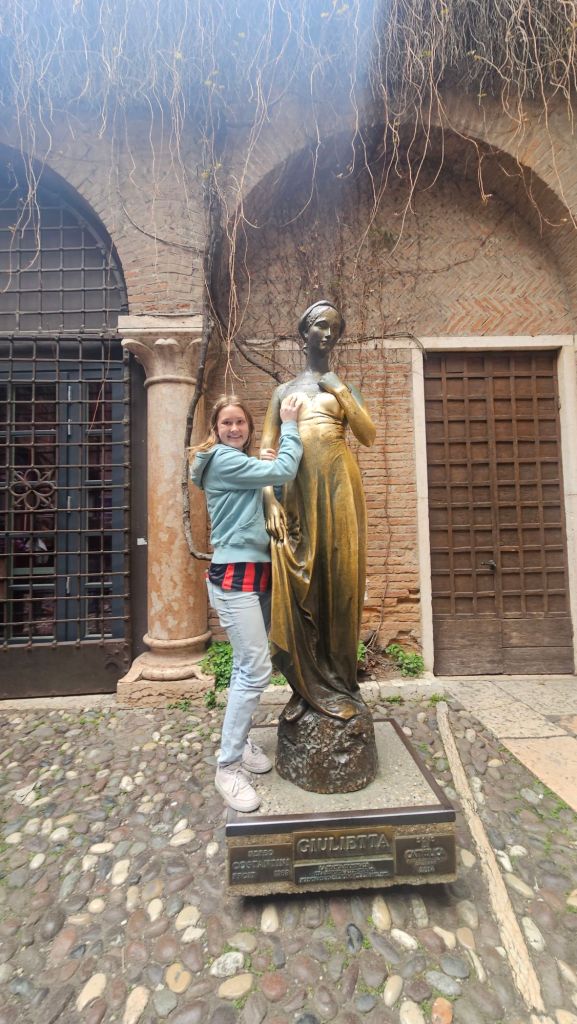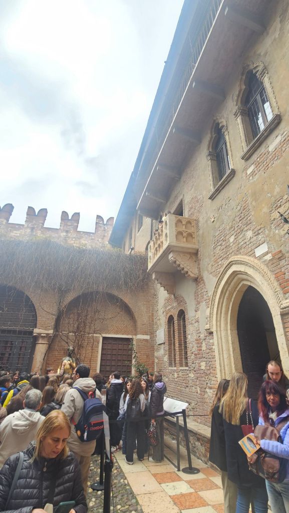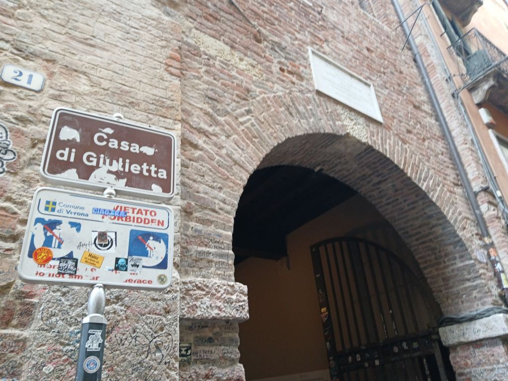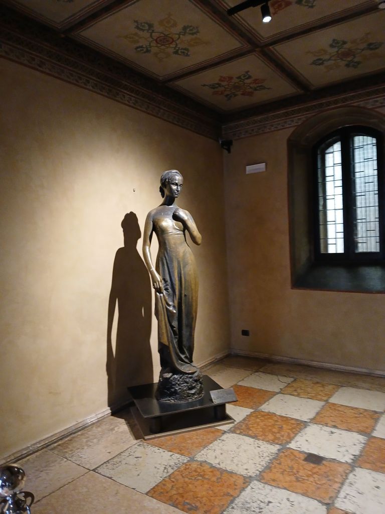 The other was Casa di Giulietta (Julliet’s House). The tradition is to write a letter to Julliet and stick it to the wall. The wall is now blocked, but there is a mailbox. The other tradition is to rub Julliet’s statue to bring good luck in love.