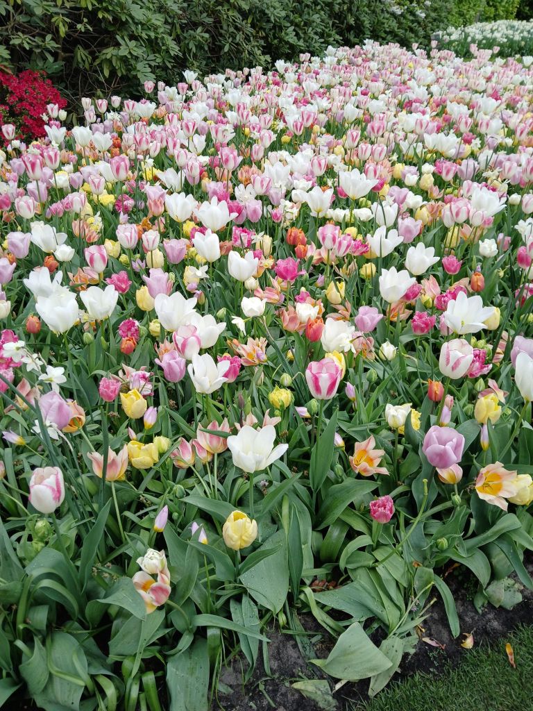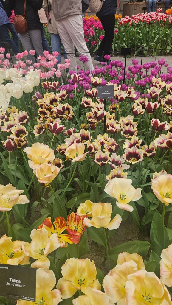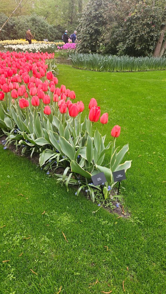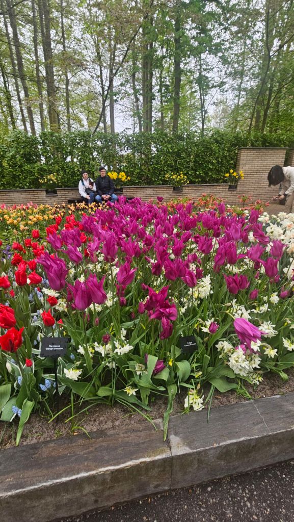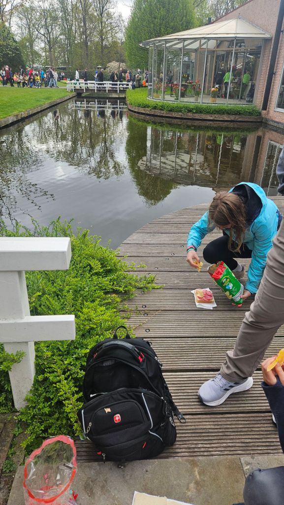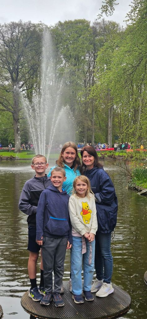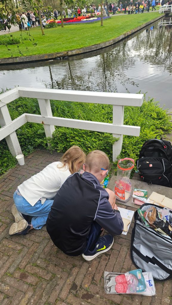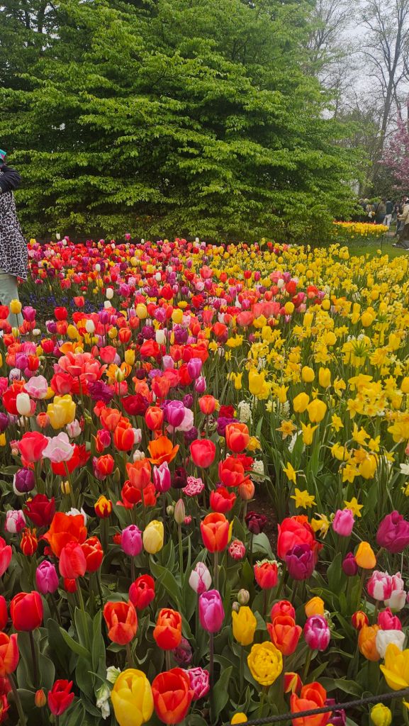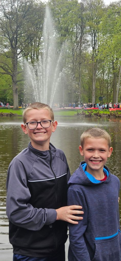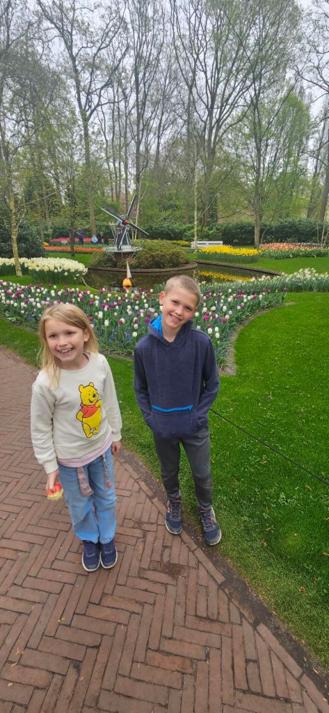 The next morning we headed to Keukenhof. It is one of the largest flower gardens in the world with over 7 million flowers, mostly tulips that bloom in the spring and it was one of my top things to see in Europe. It was amazingly beautiful! We had a picnic lunch, the kids did a scavenger hunt, and discovered tulip colors have names. I am sure by the end of the day everyone was tired of me saying “Look how beautiful,” “That color is pretty,” and “Do you smell how lovely it smells?” Get ready for flower picture overload.